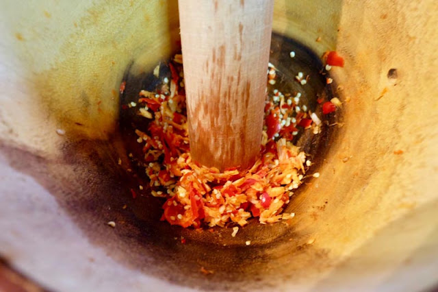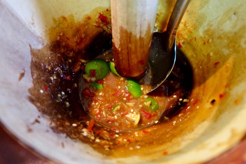 ★ ปรุงรสด้วยน้ำปลา น้ำปลาร้า น้ำมะนาว และน้ำตาลปี๊บ หั่นมะเขือเทศลงไปตามชอบ คนให้เครื่องเข้ากันดี