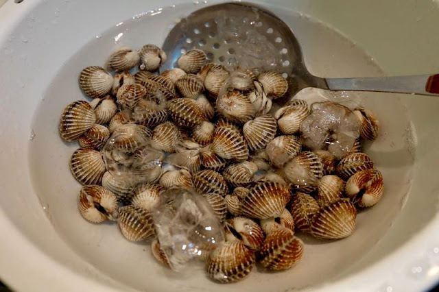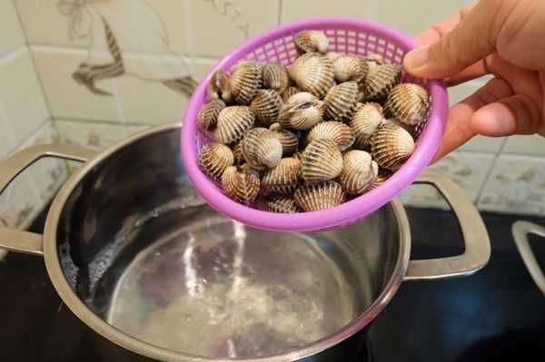 ★ นำหอยแครงล้างเปลือกให้สะอาด นำมาลวกให้สุกพอดี (ลวก 20 วินาที) จากนั้นก็แกะฝาเตรียมไว้สำหรับจะนำไปตำ