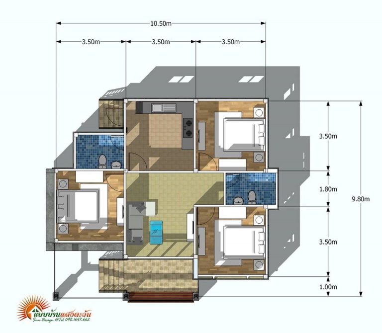สำหรับรายละเอียดและฟังก์ชั้นภายใน แบบบ้านโมเดิร์นสวยยกพื้นสูงหลังนี้ ขนาดตัวบ้านหน้ากว้าง 10.50 เมตร ลึก 9.80 เมตร ภายในจัดสรรพื้นที่ได้อย่างได้อย่าลงตัวครบพร้อมความต้องการครอบครัว ประกอบด้วย 3 ห้องนอน 2 ห้องน้ำ 1 ห้องรับแขก+ระเบียง 1 ห้องครัว+ลานซักล้าง พื้นที่ใช้สอย 85 ตร.ม. งบประมาณก่อสร้าง 9แสน – 1 ล้าน