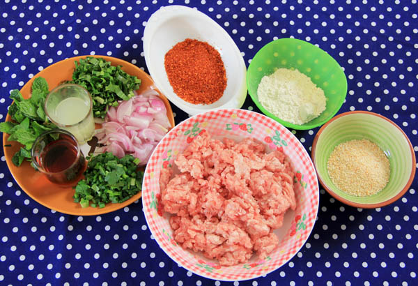 วิธีทำ เริ่มจากใส่หมูบดลงในชามผสม ใส่เครื่องปรุงต่างๆ ลงไป ทั้งน้ำปลา น้ำมะนาว พริกป่น (ใส่มากหรือน้อยกว่านี้ก็ได้ตามชอบ) ข้าวคั่ว ต้นหอม ผักชี ผักชีฝรั่ง หอมแดง แป้งข้าวโพดหรือแป้งอเนกประสงค์ จากนั้นคลุกเคล้าทั้งหมดให้เข้ากัน นวดหมูให้เครื่องปรุงซึมเข้าไปในเนื้อแล้วทิ้งไว้ 5-10 นาที